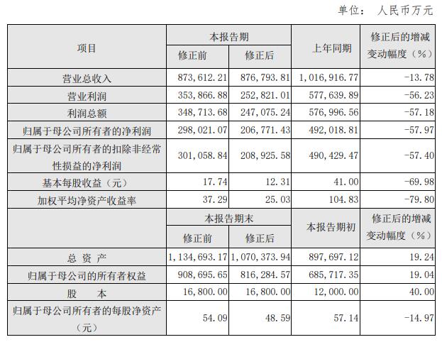昨晚,东方生物(688298.SH)发布2022年度业绩快报更正公告。修正后,2022年,东方生物营业总收入87.68亿元,同比减少13.78%;归属于母公司所有者的净利润20.68亿元,同比减少57.97%;归属于母公司所有者的扣除非经常性损益的净利润20.89亿元,同比减少57.40%。