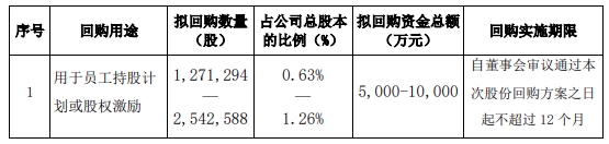 按本次回购资金总额上限人民币10,000万元、回购价格上限39.33元/股测算,回购数量约254.2588万股,回购股份比例约占公司总股本的1.26%。按照本次回购资金总额下限人民币5,000万元、回购价格上限39.33元/股测算,回购数量约127.1294万股,回购股份比例约占公司总股本的0.63%。