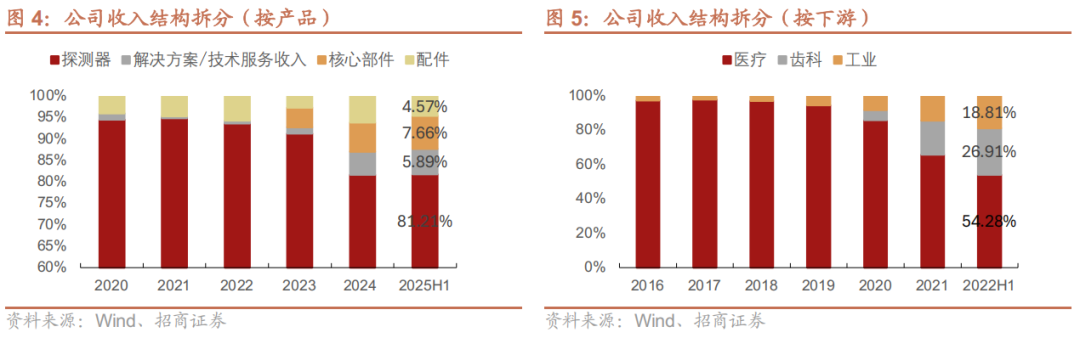 按产品拆分,核心部件品类扩张+迈向X线解决方案供应商,构筑第二增长曲线。公司战略清晰,正从单一数字化X线探测器供应商向数字化X射线影像设备核心部件及综合解决方案供应商转型。目前探测器业务是营收主要来源,2025H1实现探测器销售8.66亿元,占营业收入比重为81.21%。公司正在积极拓展高压发生器、球管、组合式射线源等新核心部件及综合解决方案业务,部分产品已逐步完成主要客户导入,开始批量交付,2025H1实现新核心部件及解决方案业务收入1.45亿元,收入占比由2024年的12.14%继续增长至2025H1的13.55%。