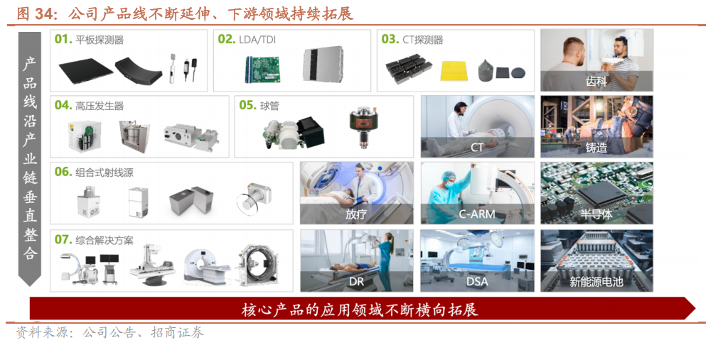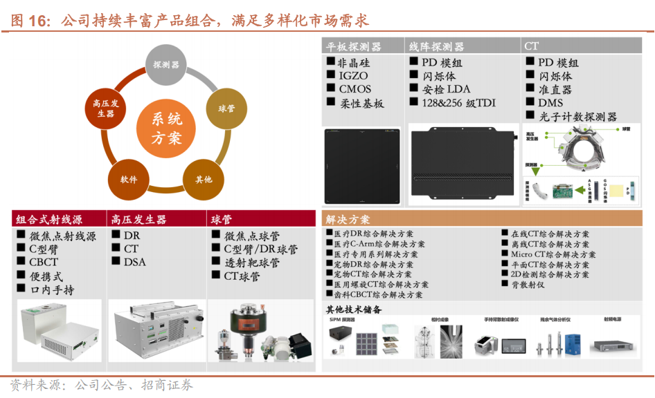 公司产品矩阵持续丰富,可覆盖市场空间持续增大。凭借在X线探测器领域多年的行业深耕经验,以及数字化X线探测器与其他X线核心部件具有高度的技术相通性,经过多年筹划及布局,公司在高压发生器、组合式射线源、球管等新X线核心部件领域已完成基础布局,并取得了一定的技术成果。