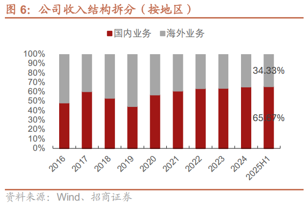 按地区拆分,海外业务为公司贡献稳定收入,国内业务占比逐年提升。公司以海外业务起家,2016-2024年海外业务收入由1.28亿元提升至6.33亿元(CAGR为22.12%)。随着工业领域(国内锂电)客户的持续拓展,公司国内业务占比逐年提升,2025H1国内业务占比达到65.67%。