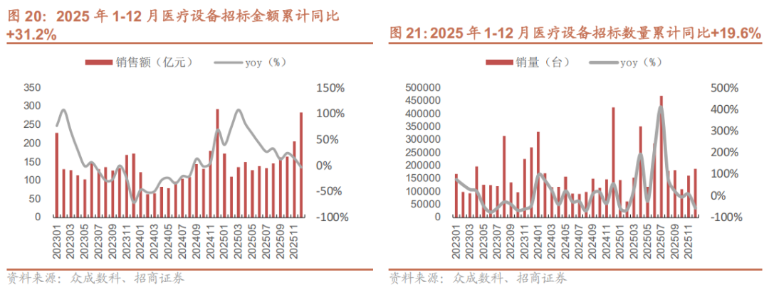 医疗设备招标显著复苏。2023H2受到医疗反腐政策影响,医疗设备招投标金额和数量均呈下滑态势。2024年3月国务院发布《推动大规模设备更新和消费品以旧换新行动方案》,提出到2027年实现医疗在内的多个领域设备投资规模较2023年增长25%以上。2024Q4各省逐步落地以旧换新政策,相关招标陆续启动,2024年11月份后,公开招标数量明显提升,月度招标金额同比增速回正。2025年医疗设备招标数据维持高位,同比增速亮眼,2025年1-12月医疗设备招标金额达到1937.59亿元,同比+31.2%,招标数量为241.65万台,同比+19.6%;从月度趋势来看,进入2025年下半年,随着2024年需求积压释放导致基数上移,增速有所放缓,但招标规模仍保持高位,环比持续上行,12月医疗设备招标金额同比-2.87%,环比+37.8%,招标数量同比-55.65%,环比+16.6%。