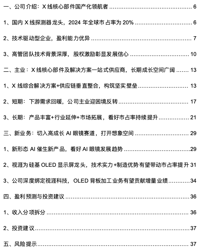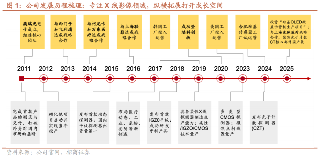 完整掌握X线核心技术,纵向不断延伸产品线,横向持续拓展应用领域。公司创立于2011年,成立以来专注于X线核心部件开发,纵向来看,公司不断丰富产品矩阵,2019年布局高压发生器、组合式射线源产品,2022年组建球管团队,2023年正式启动X线综合解决方案业务,目前已成为全球领先的X线核心部件及解决方案一站式供应商;横向来看,公司下游应用场景持续拓展,2017年布局工业、宠物、安防等新领域,2018年成功研发齿科产品。2020年公司登陆科创板。公司凭借自主研发以及产业链垂直整合,成功打破外资对X线探测器的技术垄断,持续引领X线核心部件国产替代。