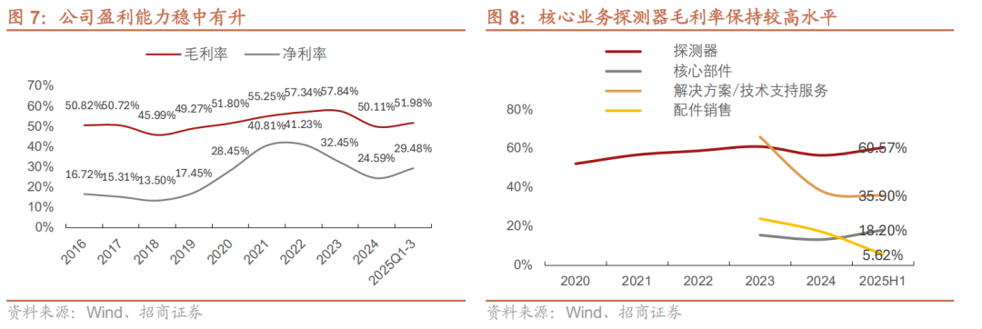公司收入&利润快速增长。2016-2024年,公司营收从2.56亿元增至18.31亿元,CAGR为27.88%,2016-2024年归母净利润从0.43亿元增至4.65亿元,CAGR为34.67%,增长驱动力来自,行业层面:①老龄化趋势、疾病谱变化促使X线核心部件在医疗领域的需求持续增长;②医疗、齿科、工业等下游应用领域不断丰富驱动X线影像设备及核心零部件持续扩容;公司层面:①凭借产品竞争力、自主创新能力和本土化服务优势,在X线探测器市占率持续提升;②高压发生器等核心部件、组合式射线源、综合解决方案等新业务开始放量。