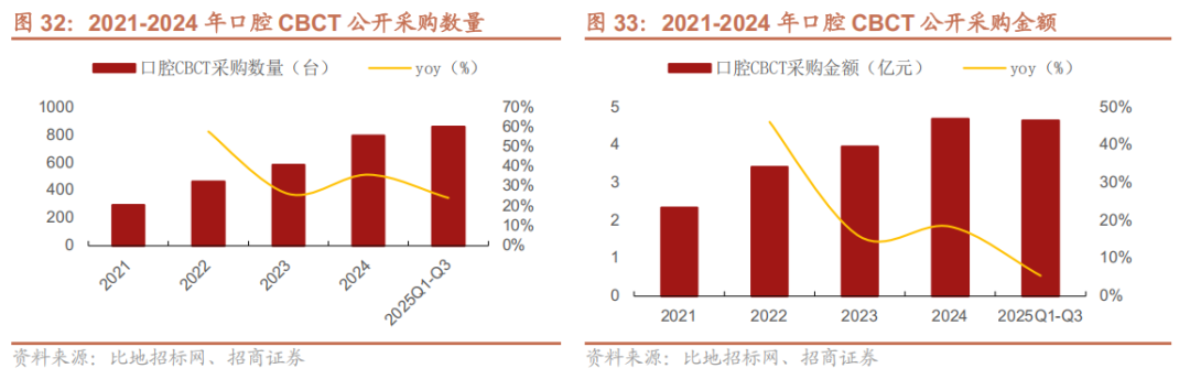口腔CBCT采购规模逐年上升。根据比地招标网,2024年国内口腔CBCT采购金额总计达4.69亿元,达到2023年的118.55%,同比2023年增速达到18.55%;2024年采购数量总计达797台,达到2023年的136.01%,同比2023年增速达到36.01%;2025年前三季度,口腔CT中标总金额约4.65亿元,中标设备数量达861台,已超2024年全年水平。