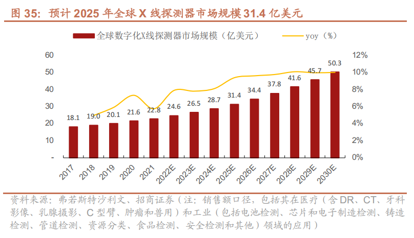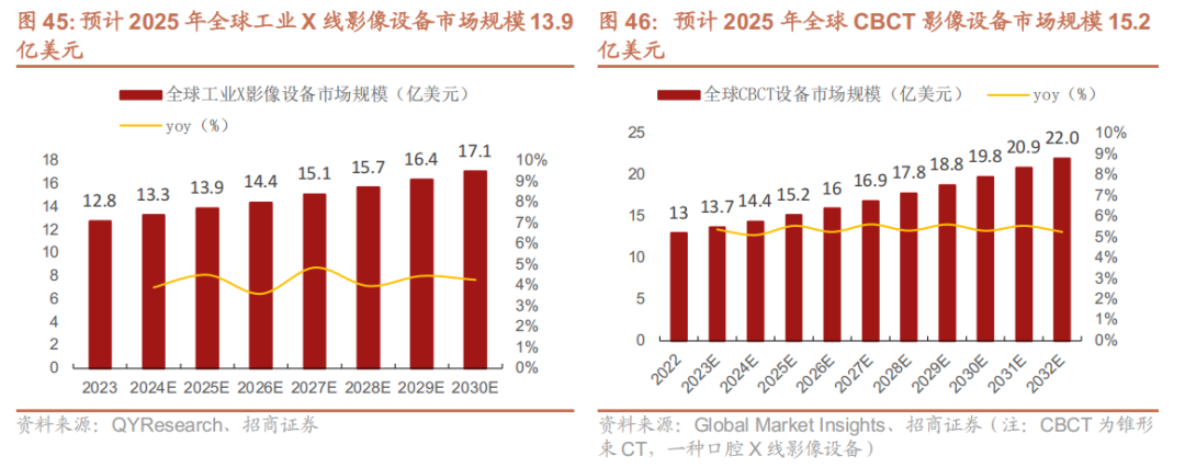 工业:随着全球传统工业整体向高端制造转型,以及三维X射线成像、TDI、实时AI判图等新X线技术的出现,X线影像设备在工业铸件、管道焊缝、PCB电路板等传统无损检测以及新能源电池检测、半导体封装检测以及食品安全检测等新工业应用领域得到了更广泛的应用,全球工业用X线影像设备的市场规模将继续扩大。根据QY Research,2023年全球工业X射线检测系统市场规模为12.8亿美元,预计到2030年将达到17.1亿美元,2024-2030年CAGR为4.28%。