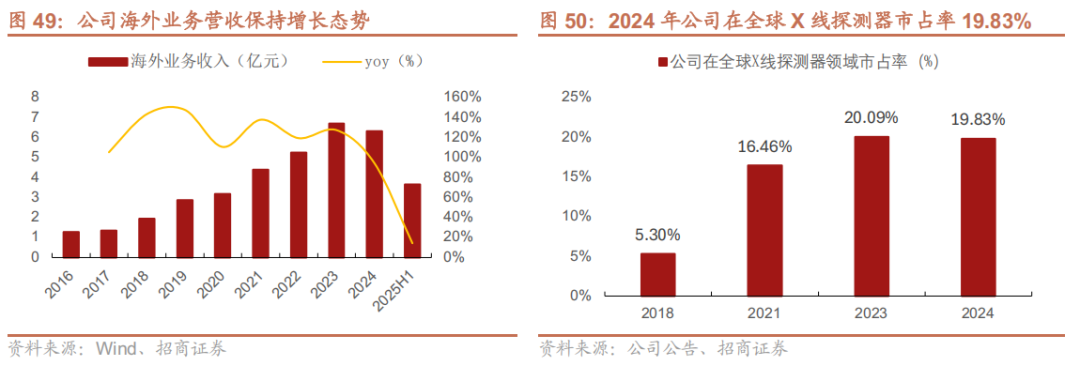 长期看,公司主业成长性主要来自三个维度:①产品维度,公司正从单一的探测器部件供应商向“探测器+射线源+高压发生器+球管+综合解决方案”的一站式供应商转型,打造光电领域的“工业超市”,持续提升产品附加值和客户粘性;②行业维度,X光为通用检测工具,受益下游应用持续拓展,市场持续扩容。纵向来看,从平面DR拓展到三维CT,再到放疗、乳腺等各类医疗领域,可覆盖行业空间持续扩大;横向来看,公司下游应用逐步拓展至PCB、半导体、铸件、航空航天、安防等工业领域检测,看好公司作为国内X线核心部件龙头,持续开启无边界扩张;③市场维度,2025H1海外业务占比34%,公司把出海作为重点拓展的方向,未来在印度、拉丁美洲、非洲、东南亚等新兴市场发展空间较大,看好公司综合市占率持续提升。