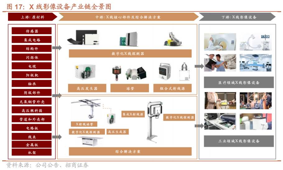 X线影像设备原材料壁垒高,对核心部件性能影响大。X影像设备产业链的上游为X线核心部件的原材料,具有较高的技术壁垒,对X线核心部件的性能、质量、产业化都有着重要影响。X线探测器的原材料主要包括传感器、芯片、闪烁体、结构件和电缆;高压发生器的原材料主要包括高压燃料箱、外壳部件、电路板、线束和金属板;球管的原材料主要包括阳极靶材、轴承、阴极部件和无氧铜管壳等。部分原材料如工业及安检LDA探测器中的碘化铯晶体(CsI)和钨酸镉晶体(CWO),医疗CT探测器所用的硫氧化钆陶瓷(GOS),国内相关高性能产品大都被外资企业垄断,面临着价格高、交期长、供应不稳定等问题,存在被“卡脖子”的风险。