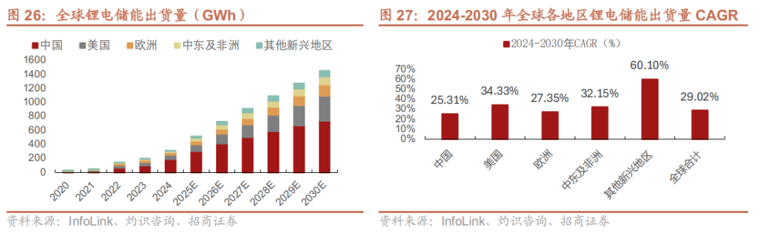 ①政策驱动储能市场进入新周期:2025年1月,发改委与能源局联合下发136号文,取消了新能源强制配储,推动国内大储从政策托底转向市场竞争,各地方政府密集出台储能容量电价补偿政策,经济性带来大量配储需求;9月印发《新型储能规模化建设专项行动方案》,提出到2027年,全国新型储能装机规模达到180GW以上,带动项目直接投资约2500亿元。根据CNESA和InfoLink数据,中国锂电储能出货量将由2024年的189.7GWh增长至2030年的734.4GWh,2024-2030年CAGR达到25.31%,中国占全球储能电池需求比重将保持在50%以上。