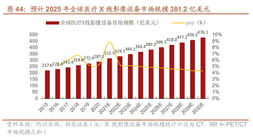 X线影像设备:X线影像设备主要包含X线探测器、高压发生器、球管三大核心部件,成本占比超过70%。根据灼识咨询、QYResearch、Global Market Insights数据,2023年全球X线影像设备市场规模为372.6亿元,预计到2030年将增长至513.0亿美元,2023-2030年CAGR为4.67%。
