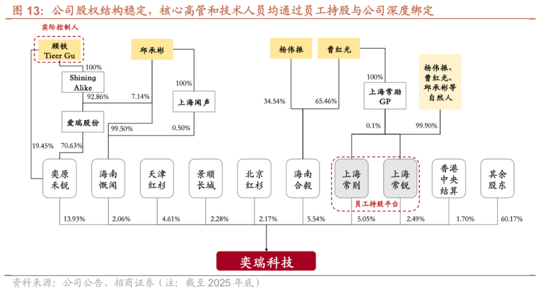 股权结构稳定,核心高管和技术人员均通过员工持股与公司深度绑定。公司实际控制人为董事长、总经理顾铁,截至2025年末,顾铁通过奕原禾锐等间接持有公司13.93%股份。公司通过上海常则和上海常锐两个员工持股平台对核心高管和技术人才进行深度绑定,有利于公司长期发展。