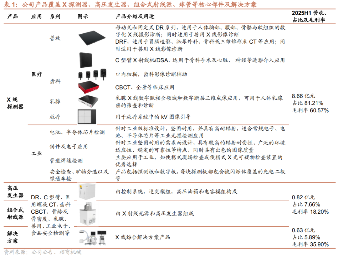 围绕核心产品X线探测器,持续丰富产品品类。X线探测器业务贡献公司主要收入,同时公司持续完善产品布局,在高压发生器、球管和组合式射线源等领域已完成样机研发及部分型号量产交付。2025H1公司X线探测器、核心部件(高压发生器、组合式射线源、球管等)、服务收入(解决方案)分别占营收比例为81.21%、7.66%和5.89%。