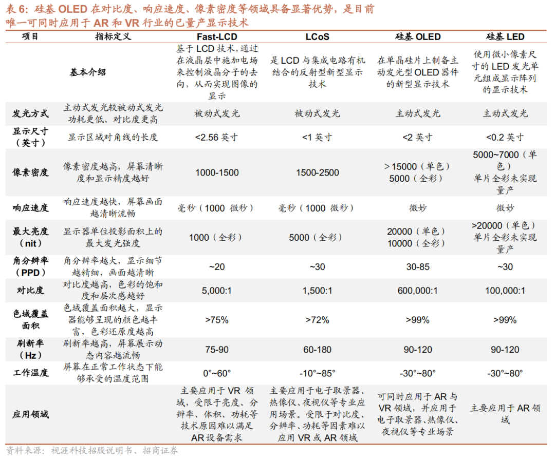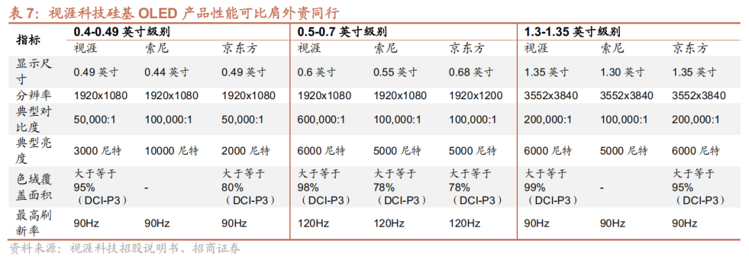 技术实力:产品性能比肩外资同行,率先实现国产替代。视涯是全球少数具备硅基OLED“显示芯片+微显示屏+光学系统方案”全栈自研能力的科创企业。创新性地自研硅基OLED强微腔技术、硅基OLED串扰截断技术和硅基高光效叠层OLED全彩技术、低温滤光彩膜工艺技术等一系列核心技术。根据视涯科技招股说明书,公司的“超高解析度硅基OLED显示器件”,作为2020年安徽省重点领域补短板产品和关键技术攻关项目成果,被认定为打破了索尼等境外企业对相关产品的垄断局面,产品技术水平国际领先并填补了国内产业空白。