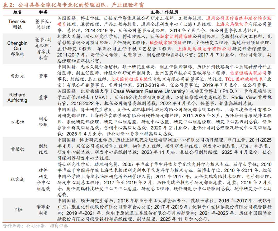 高管团队技术背景深厚,从业经验丰富。公司拥有由多名行业内专家组成的技术管理团队,平均行业经验超过20年。公司团队在医疗和工业影像领域有深厚的技术和学术积累,具备大型跨国公司工作经验及海外背景,能够前瞻性把握行业发展方向,为公司发展保驾护航。
