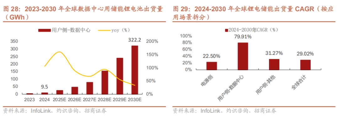 ③“AIDC+储能”新场景催生配储新需求:随着AI技术迅猛发展,全球数据中心爆发增长,能耗问题提上日程,为平衡电力负荷保障供电稳定,电化学储能可配合新能源发电为AIDC提供稳定、绿色、低价的电力供应。根据InfoLink和灼识咨询数据,全球数据中心用锂电储能将从2024年的9.5GWh增长至2030年的322.2GWh,2024-2030年CAGR达到79.91%。