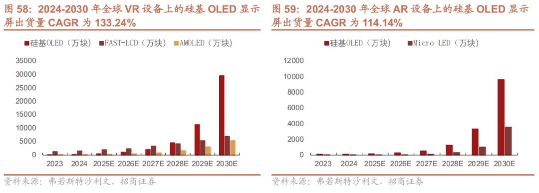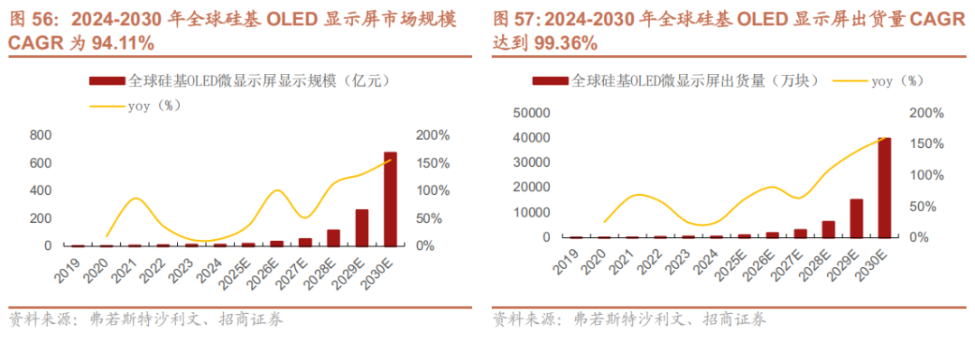 市场规模:销售额口径,全球硅基OLED显示屏市场规模由2020年的3.9亿元增长至 2024年的12.7亿元,2020-2024年CAGR达34.3%,预计到2030年将增长至679.3 亿元,2024-2029年CAGR为94.11%;出货量口径,2024年全球硅基OLED显示屏出货量为636.5万块,预计2030年出货量为39956.6万块,2024-2030年CAGR达到99.36%。