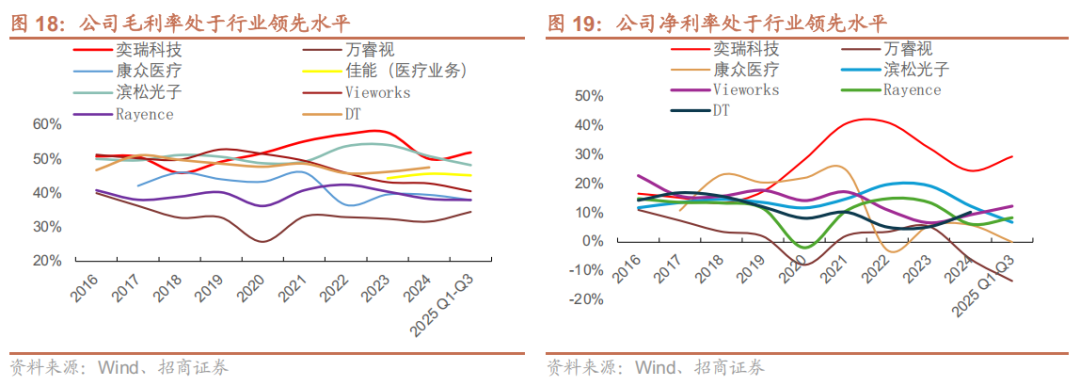 业绩短期承压后逐步修复。2024年公司营收下滑,主要系医疗反腐影响招标、工业锂电资本开支停滞,以及齿科新建诊所数量放缓,下游对X线核心部件和影像设备需求下滑所致。2025年,随着医疗招标复苏,锂电扩产恢复,公司营收和利润重回双位数增速通道,2025年前三季度实现营收15.49亿元,同比增长14.22%,归母净利润4.71亿元,同比增长20.61%。