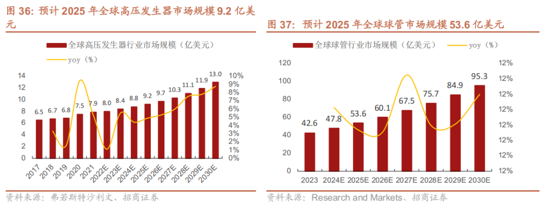球管:根据Research and Markets,2023年全球球管行业市场规模为42.6亿美元,预计到2030年市场规模将增长至95.3亿美元,2023-2030年CAGR为12.2%。