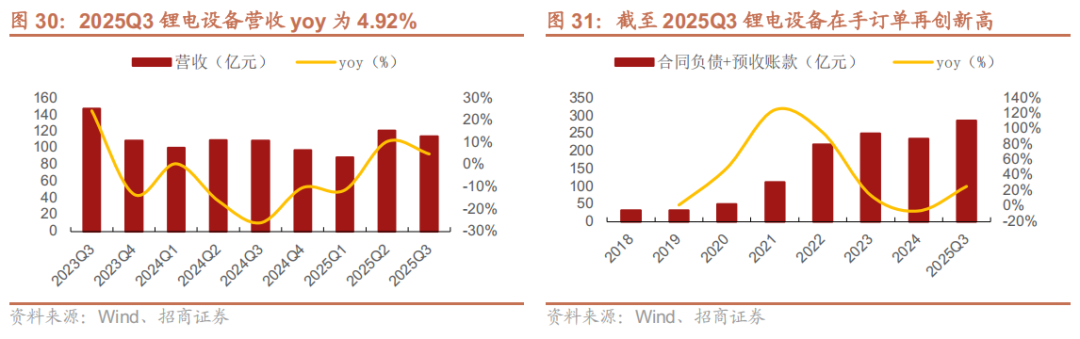 业绩触底反弹,基本面拐点确定。2025Q3锂电设备板块实现营收114.25亿元,同比+4.92%,实现归母净利润3.77亿元,同比+71.17%,单季度收入连续2个季度转正,同时利润端由负转正,重回双位数增速通道。
