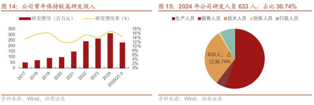 费用管控持续优化,研发投入保持高位。2016-2025年前三季度,公司期间费用率从31.02%下降至24.14%,2025Q1-Q3公司销售、管理、财务、研发费用率分别为4.58%、5.27%、-0.42%和14.71%,同比-0.66pct/-0.69pct/-0.18pct/-3.55pct,反映出规模效应以及经营效率的稳步提升。在研发方面,公司继续保持高强度投入,近五年研发费用率保持在12-17%的较高水平,2025年前三季度研发费用率达到14.71%,为技术壁垒的巩固和产品线的拓展提供了有力支撑。在销售投入方面,公司销售费用率稳中有降,近五年维持在5%左右水平,较低的销售费用投入体现出公司系强产品力带来的技术驱动型销售。