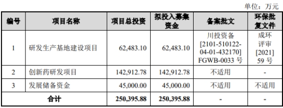 海创药业本次发行募集资金总额106,269.92万元,募集资金净额为99,511.33万元;公司2022年4月7日披露招股书显示,公司拟募集资金250,395.88万元,计划用于研发生产基地建设项目、创新药研发项目、发展储备资金。