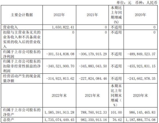 海创药业2022年年报显示,公司2022年营业收入为165.08万元;归属于上市公司股东的净利润为-3.02亿元,上年同期为-3.06亿元;归属于上市公司股东的扣除非经常性损益的净利润为-3.41亿元,上年同期为-3.46亿元;经营活动产生的现金流量净额为-3.15亿元,上年同期为-2.28亿元。