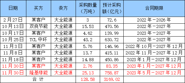 公告一,大全能源全资子公司近日与隆基绿能(601012.SH)及其9家子公司签订了《采购协议》,合同约定2023年5月至2027年12月隆基绿能预计采购多晶硅料共25.13万吨。