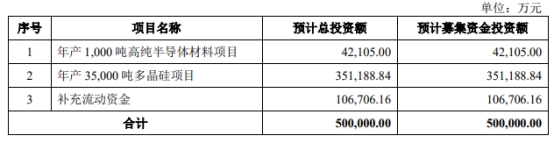 大全能源于2021年7月22日在上海证券交易所科创板上市,本次公开发行股份数为300,000,000股,发行股份占公司发行后股份总数(1,925,000,000股)的比例为15.58%,本次发行价格为21.49元/股,保荐机构(主承销商)为中国国际金融股份有限公司,保荐代表人为张志强、陈玮。公司此次募集资金总额为644,700.00万元,募集资金净额为606,719.18万元,较原计划多106,719.18万元;大全能源2021年7月19日披露招股书显示,公司拟募集资金500,000.00万元,计划用于年产1,000吨高纯半导体材料项目、年产35,000吨多晶硅项目、补充流动资金。