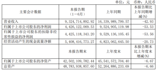 大全能源(688303.SH)昨日晚间披露2023年半年度报告,公司2023年上半年营业收入为93.25亿元,同比下降42.93%;归属于上市公司股东的净利润为44.26亿元,同比下降53.53%;归属于上市公司股东的扣除非经常性损益的净利润为44.25亿元,同比下降53.56%;经营活动产生的现金流量净额为54.08亿元,同比减少20.73%。