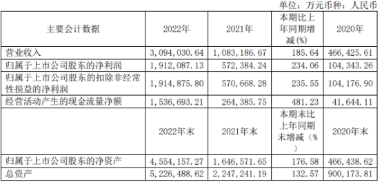 大全能源2022年营业收入为309.40亿元,同比增长185.64%;归属于上市公司股东的净利润为191.21亿元,同比增长234.06%;归属于上市公司股东的扣除非经常性损益的净利润为191.49亿元,同比增长235.55%;经营活动产生的现金流量净额为153.67亿元,同比增加481.23%。