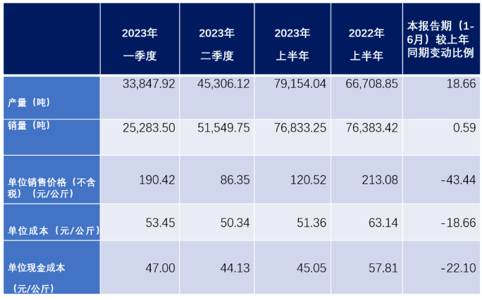 整体来看,2023年上半年,公司去库存策略已见成效:上半年产量为7.92万吨,销量为7.68万吨。