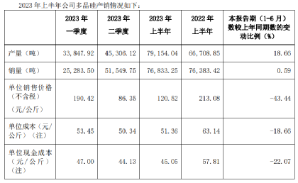 大全能源半年报显示,公司多晶硅产能方面同比增长,2023年上半年多晶硅生产7.92万吨,同比增长18.66%。根据中国光伏行业协会数据,今年上半年国内多晶硅产量约65.17万吨,仅大全能源就占了国内产量超1/10。值得注意的是,2022年上半年大全能源多晶硅单位销售价格为213.08元/公斤(21.31万元/吨),2023年上半年就下降到120.52元/公斤(12.05万元/吨),价格跌幅为43.44%;2022年上半年多晶硅单位成本为63.14元/公斤(6.31万元/吨),2023年上半年成本下降至51.36元/公斤(5.14万元/吨),减少18.66%。