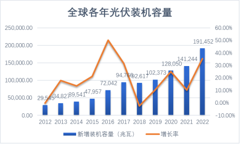 全球光伏装机容量近年来的高速增长如下图所示: