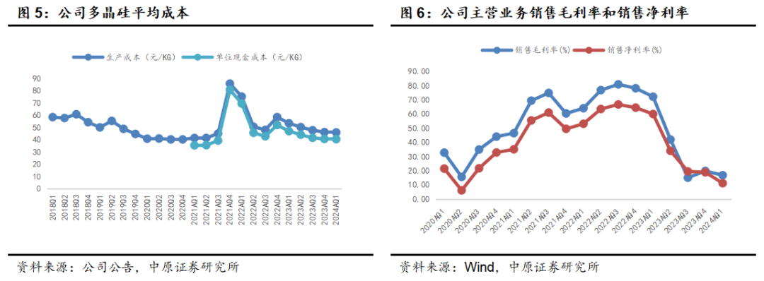 公司2024年一季度业绩继续受行业价格低迷拖累。2024年第一季度,多晶硅料价格仍处于探底阶段,公司业绩继续呈现下滑态势。公司一季度销售多晶硅53987吨,同比增长113.5%;单位销售价格(不含税)54.92元/千克,同比下降71.16%;单位成本45.99元/千克,同比下降13.96%。值得一提的是,公司单位成本保持下降趋势,部分缓解产品价格下降压力。