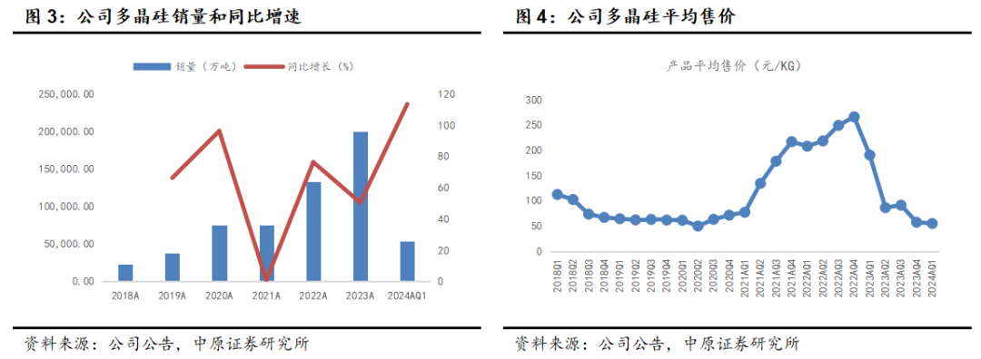 公司优化产品结构提升N型多晶硅料占比,降本增效缓解盈利压力。太阳能电池的升级迭代带动N型硅料的市场需求。公司是较早实现批量供应N型多晶硅的企业之一,2024年第一季度,公司N型多晶硅料产量、销量分别达4.3万吨、3.7万吨,占比69%和68.6%。公司内蒙产线具备100%的N型硅料生产能力,新疆产线具备60-70%的N型占比,并通过技改进一步提升N型产能。在提升N型产能占比的同时,公司通过分级能量回收、分级废水回收、还原系统智能控制及对六氯乙硅烷(Si?Cl?)高沸裂解回收等措施,降本增效。2023Q1、2023Q2、2023Q3、2023Q4、2024Q1公司多晶硅生产成本分别为53.45、50.34、47.77、46.25和45.99元/千克,呈持续降低趋势。
