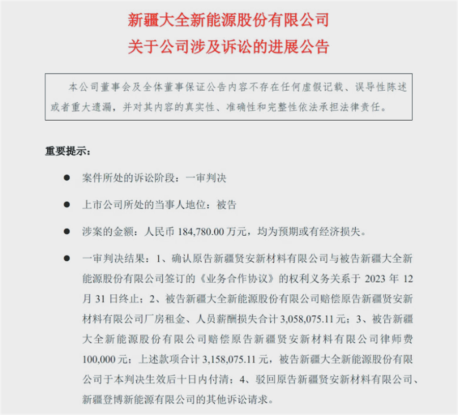 不过,大全能源强调,新疆登博新能源有限公司仅是贤安公司的关联方,非直接协议签署者,其索赔的共同利润损失是基于长期合作预期的估算,并非实际损失或协议规定金额。此外,大全能源认为自己并未违反协议核心条款,因此不认同原告的索赔主张。