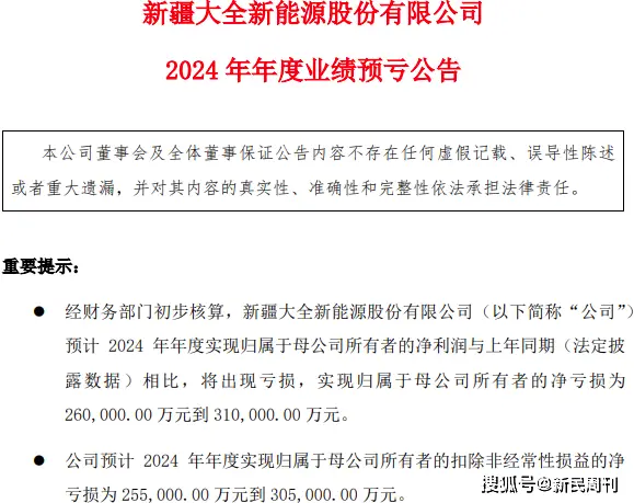 大全能源在预亏公告中表示,经财务部门初步核算,预计2024年归属于母公司所有者的净利润与上年同期相比,将出现亏损,且净亏损预计为26亿元到31亿元。