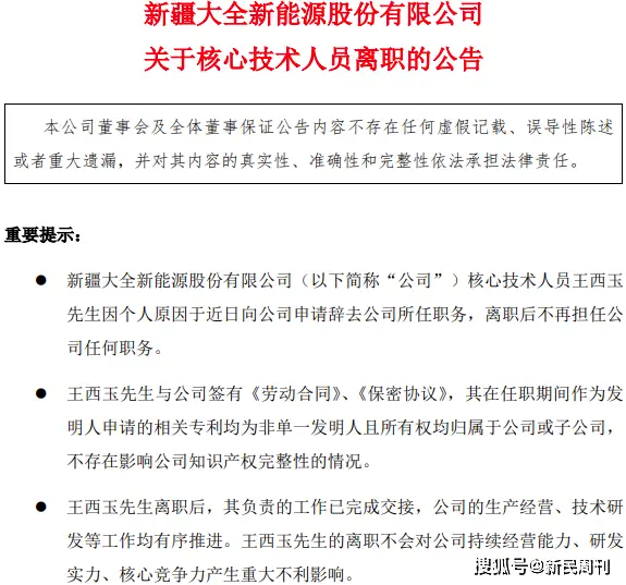 早在2024年10月16日,大全能源的核心技术人员胡平,同时也是副总经理,就提出了离职。大全能源提拔了潘和平、莫可璋补缺。然而仅仅两周后,王西玉就辞去了总经理职务,不过此时仍然属于核心技术人员,尚未离开大全能源。但次日副总经理曹伟也提交了离职,并且不再担任大全能源任何职务,彻底和大全能源断干净了工作关系。