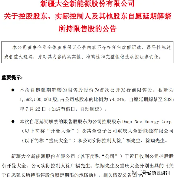 今年1月18日,大全新能披露了自愿延期解禁限售股股份的公告,将约15.93亿股(占公司总股本的74.24%)的限售股股份自愿延期解禁至2025年7月22日。这对于投资者是个好消息,客观上也对冲了一部分因业绩预亏和核心技术人员王西玉离职带来的不利影响。但长远来看,投资者并不参与实际经营,大全新能的业绩更多还是要依靠高管、核心技术人员、以及基层员工的共同努力来实现,如何尽快提高后者的满意度降低离职率稳定人心,对大全能源未来的走向至关重要。