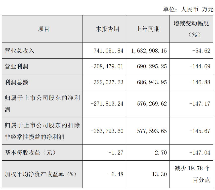 中国经济网北京2月28日讯大全能源(688303.SH)昨日晚间披露2024年度业绩快报公告,报告期内公司实现营业收入741,051.84万元,同比减少54.62%;实现归属于上市公司股东的净利润-271,813.24万元,同比减少147.17%;归属于上市公司股东的扣非净利润为-263,793.60万元,同比减少145.67%。