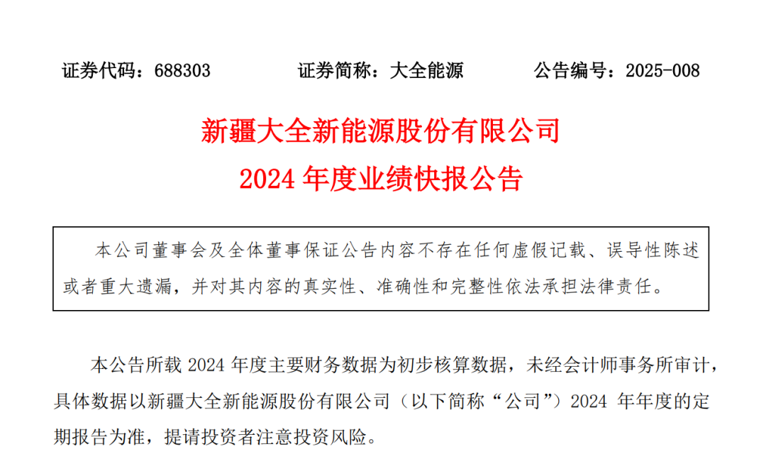 经初步核算,大全能源在2024年实现营业收入约74.1亿元,同期归母净利润出现了约27.2亿元的亏损,其中前三季度亏损约11亿元,第四季度亏损16亿元。
