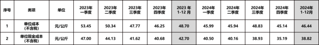 2024全年的单位销售成本和现金成本也分别仅有46.44元/公斤和38.82元/公斤,显著低于2023年同期水平。