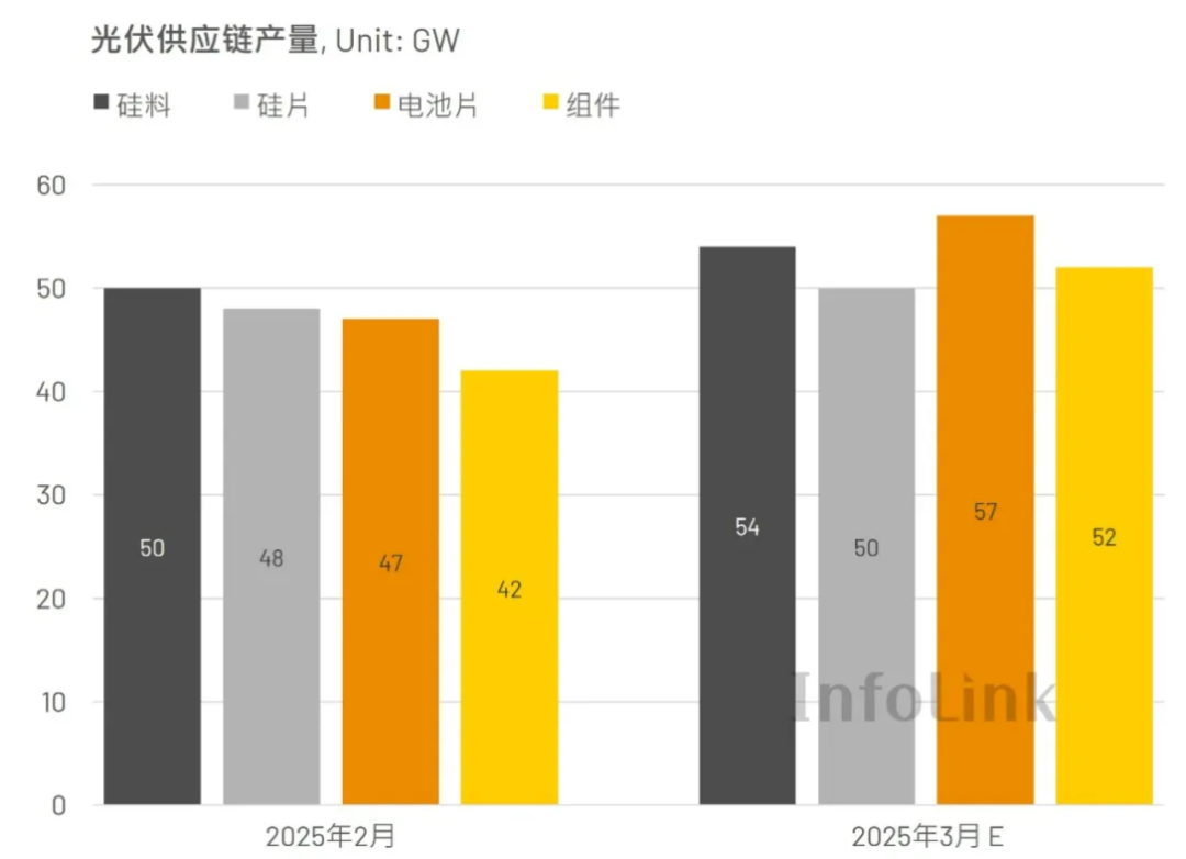 而在硅料下游的硅片、电池、组件等环节,排产同样进行地如火如荼。其中,硅片预计3月份排产49.6GW,环比上升3%;电池预计排产57.4GW,环比上升22%;而同期组件排产则预计为52.0GW,环比上升24%。