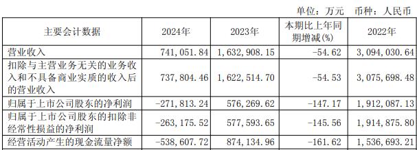 2024年,大全能源实现营业收入74.11亿元,同比下降54.62%;归属于上市公司股东的净利润-27.18亿元,上年同期为57.63亿元;归属于上市公司股东的扣除非经常性损益的净利润-26.32亿元,上年同期为57.76亿元;经营活动产生的现金流量净额-53.86亿元,上年同期为87.41亿元。