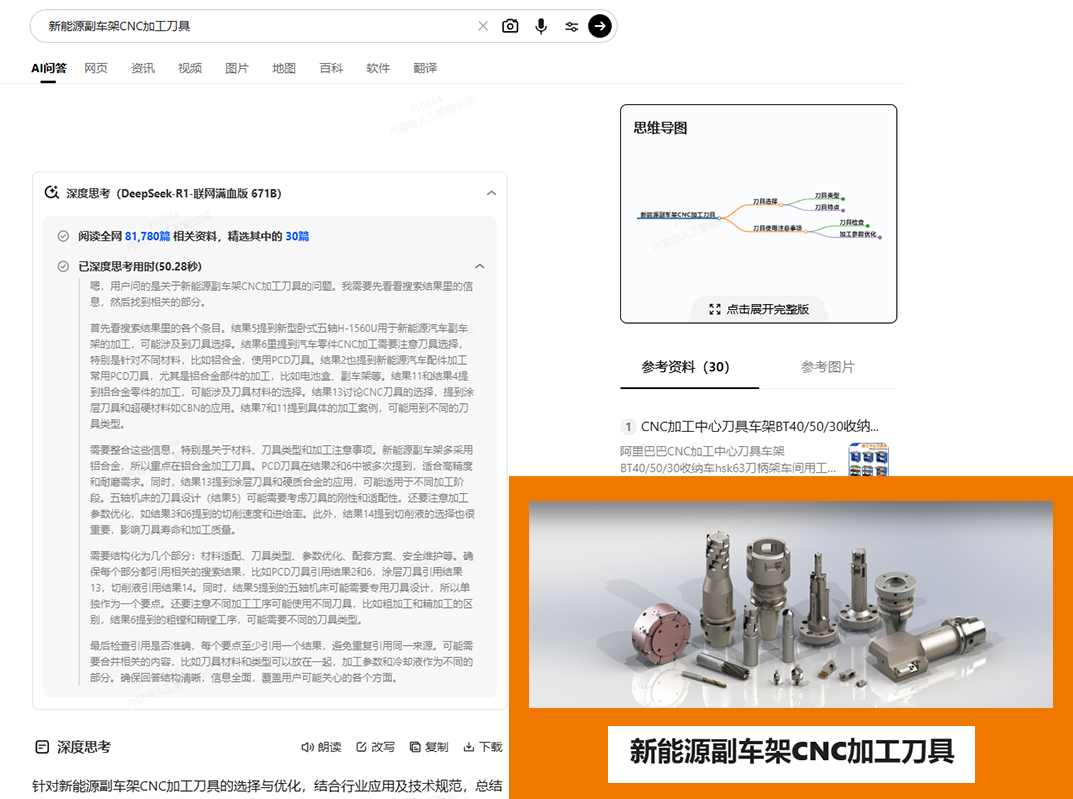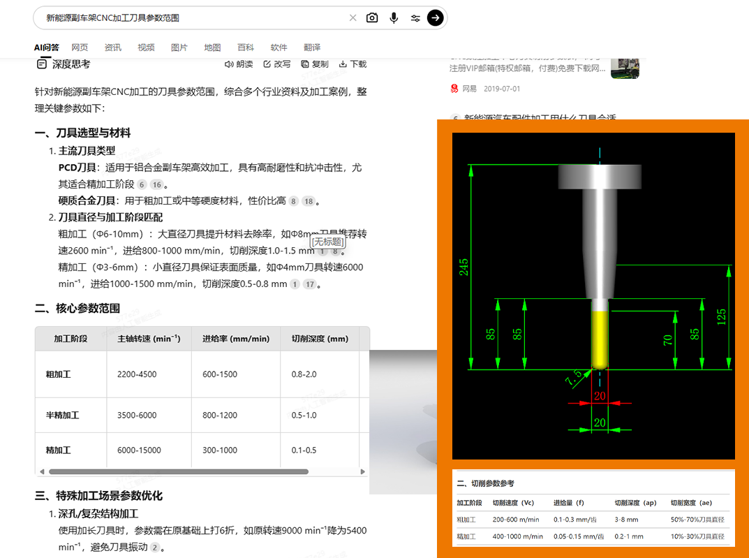 DeepSeek分析零件铝合金材质与深腔结构,精准匹配定制化PCD刀具,搭配硬质合金粗铣刀,AI优化切削参数(转速12000rpm、进给0.2mm/齿),刀具寿命延长2倍,加工节拍缩短15%。