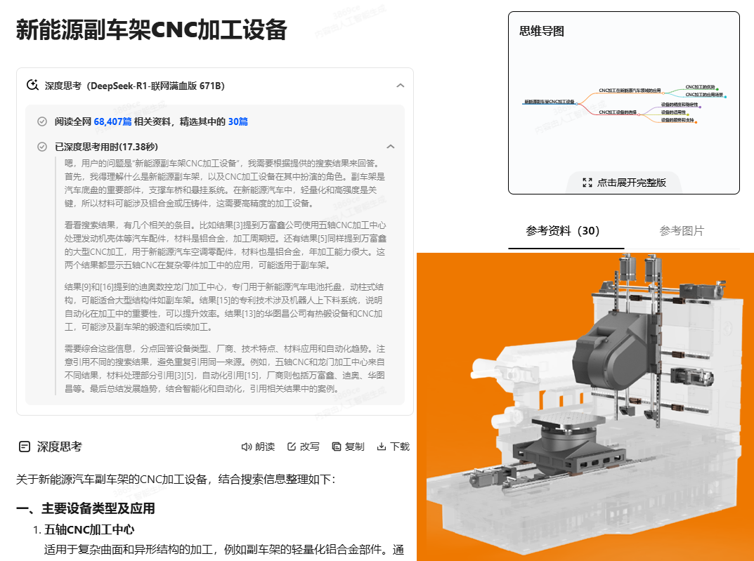 DeepSeek通过海量加工数据建模分析,快速锁定科德KHMC125UT——高刚性结构、±0.003mm精度、五轴联动无缝衔接,完美适配新能源轻量化材料的加工特性