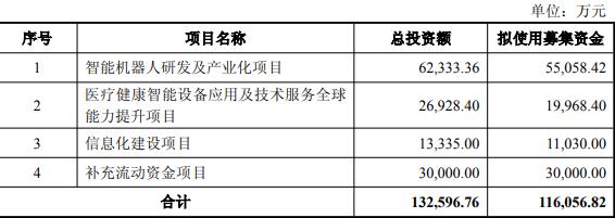 本次向特定对象发行股票募集资金总额不超过人民币116,056.82万元(含本数),扣除相关发行费用后的募集资金净额拟用于智能机器人研发及产业化项目、医疗健康智能设备应用及技术服务全球能力提升项目、信息化建设项目、补充流动资金项目。