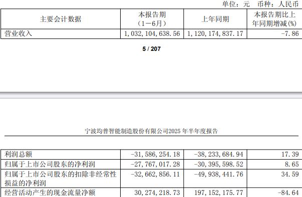 据公司2025年半年报,报告期内,公司实现营业收入10.32亿元,同比减少7.86%;归属于上市公司股东的净利润-2776.70万元,上年同期-3039.56万元;扣除非经常性损益后的净利润-3266.29万元,上年同期-4993.84万元;经营活动产生的现金流量净额3027.42万元,同比减少84.64%。