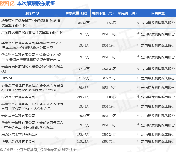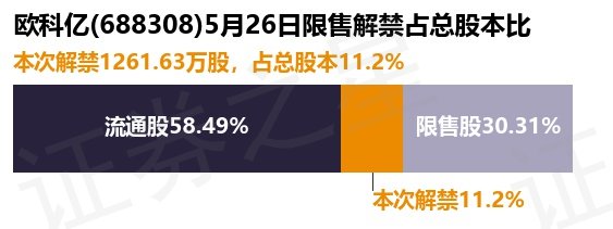 根据市场公开信息整理,欧科亿(688308)于5月26日将有1261.63万股限售股份解禁上市,为公司定向增发机构配售股份,占公司总股本11.2%。最近一年内,该股累计解禁125.0万股,占总股本的1.11%。本次解禁后,公司还有3412.92万股限售股份,占总股本30.31%。具体如下图所示: