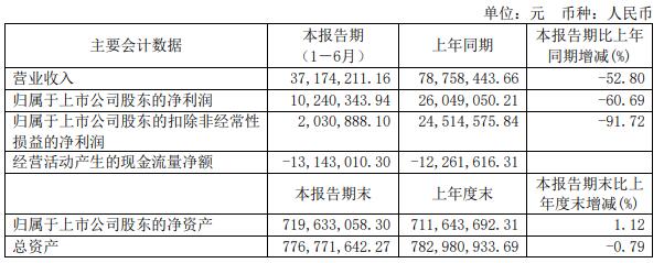 今年上半年,恒誉环保实现营业收入3717.42万元,同比减少52.80%;归属于上市公司股东的净利润1024.03万元,同比减少60.69%;归属于上市公司股东的扣除非经常性损益的净利润203.09万元,同比减少91.72%;经营活动产生的现金流量净额-1314.30万元,上年同期为-1226.16万元。
